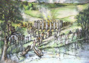 The stones at Bluestonehenge were dragged 150 miles from the Welsh mountains and set in a circle measuring 10m in diameter and surrounded by a ditch with an external bank – the henge. The outer henge was built c.2400 BC but arrowheads found in the stone circle suggest the stones were put up as much as 500 years earlier. It appears the stones were removed sometime during the Neolithic era, and some were then used up the road at Stonehenge when it underwent a major rebuild c.2500 BC. Archaeologists know that after this date Stonehenge consisted of about 80 Welsh stones and 83 local, sarsen stones so maybe some of the stones now standing at the centre of Stonehenge once stood on the banks of the River Avon. Tests to obtain radiocarbon dates from pickaxes made from deer antlers found at Bluestonehenge will give a more accurate picture of the sequence of events.